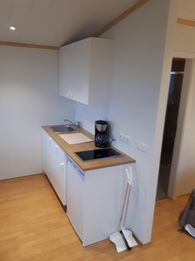 The kitchenette at Snaebyli Cottage has microwave, stove, fridge, and coffee maker. The cupboards are stocked with pots, pans, oil, and basic seasonings.