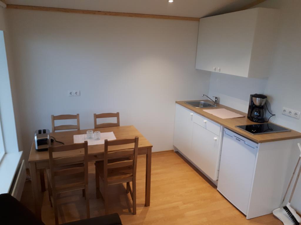 This cottage measures 28 square meters and offers all basic amenities for a comfortable stay in South Iceland. In the general living area, there is one double bed plus a pull-out sleeper sofa. There's a table where guests can enjoy breakfast or dinner, plus a small coffee table for books and games.
