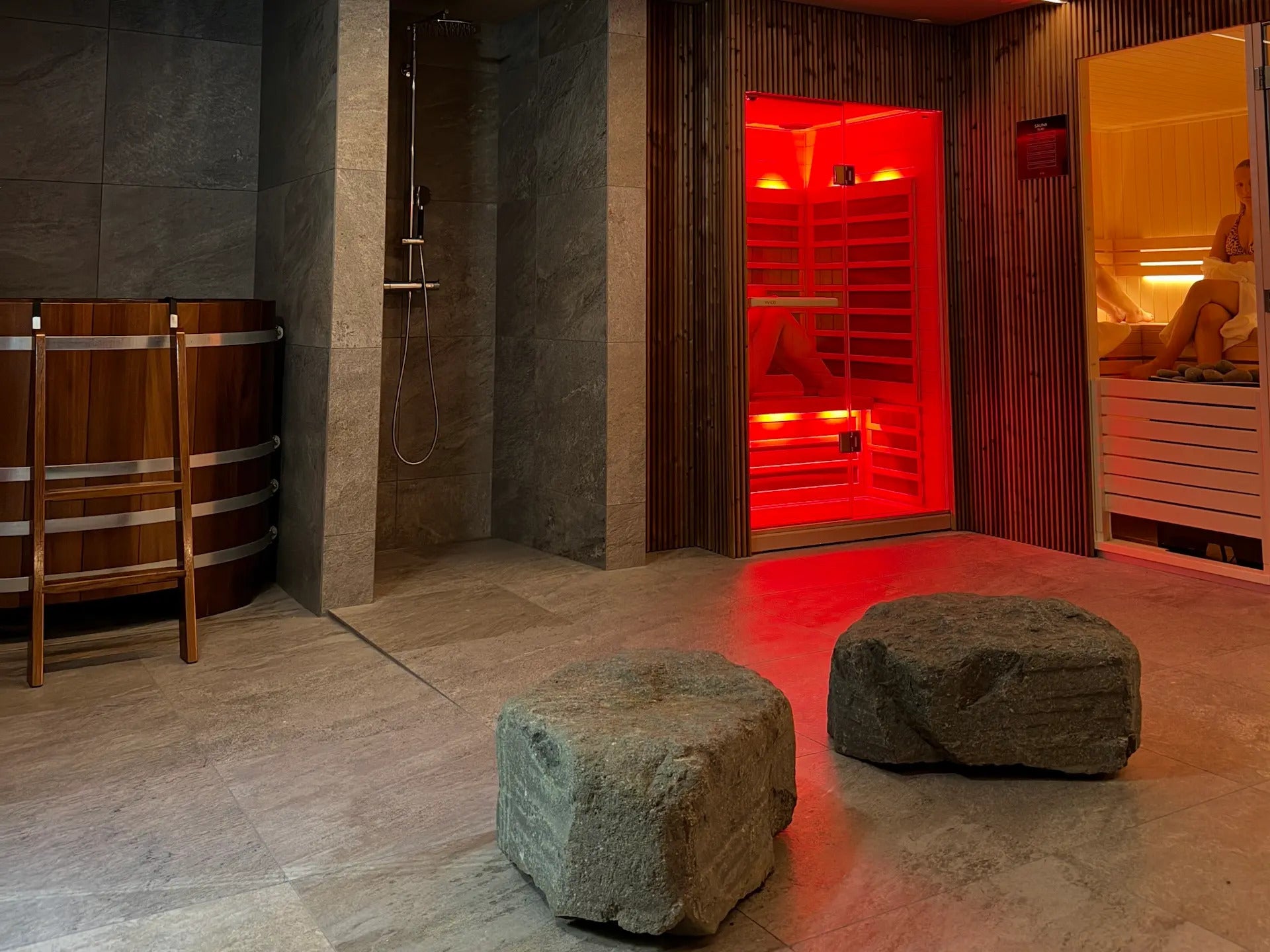 The on-site spa rejuvenates body and mind with an outdoor hot tub, infrared sauna, cold pot, relaxation area, and treatment room.