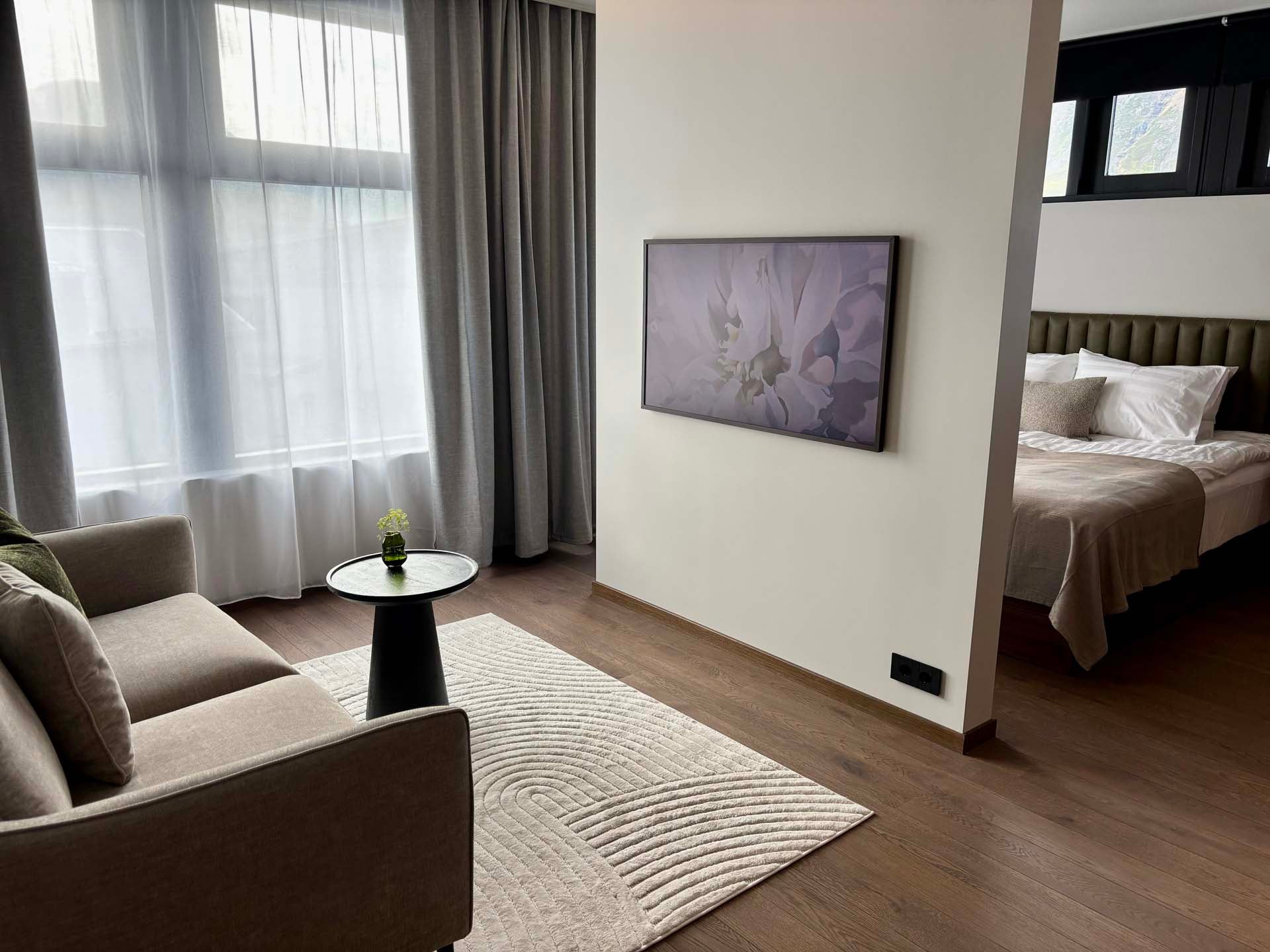 Guests can also enjoy a private kitchenette and minibar, complete with a refrigerator, coffee machine with daily Illy capsule refills, tea, milk, sugar, and a kettle. A complimentary breakfast is served each morning at the on-site restaurant, featuring fresh local ingredients and classic Icelandic flavors.