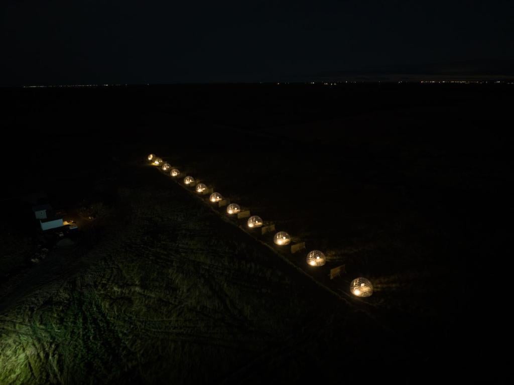 The pods have a double bed, a small table, and a pair of chairs. For convenience, bathroom facilities are in a service house just a few steps from the igloos. Additionally, each pod is equipped with heating to ensure comfort during chilly nights, allowing for a snug environment regardless of the weather outside.
