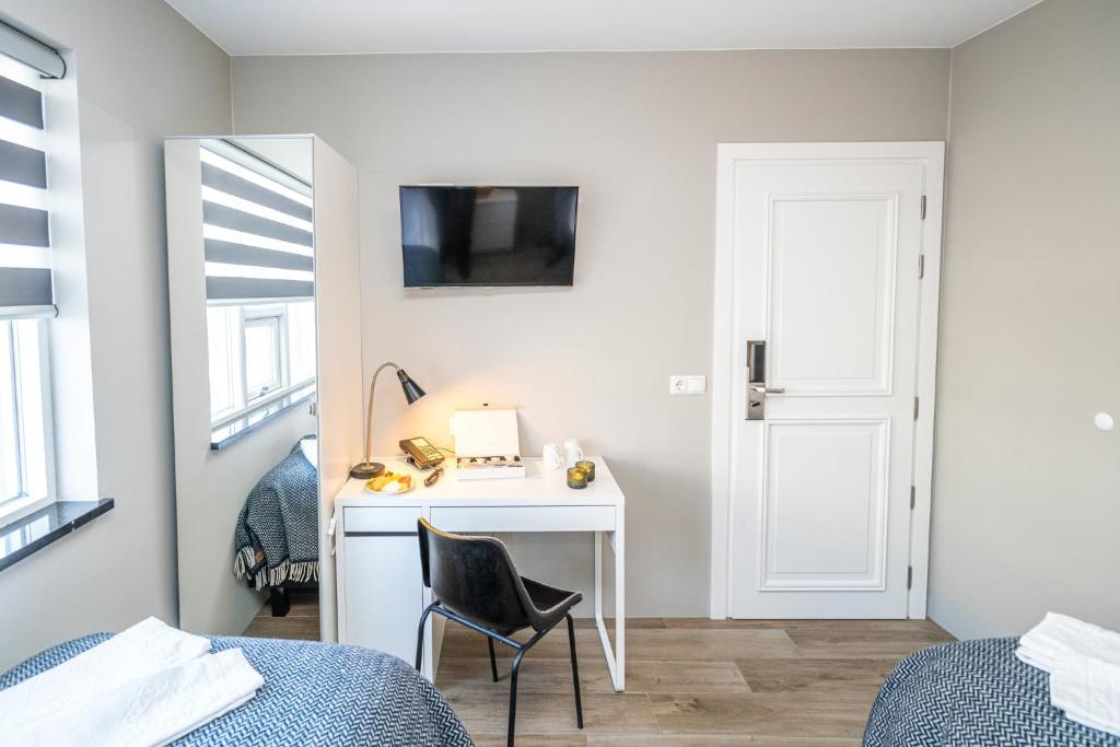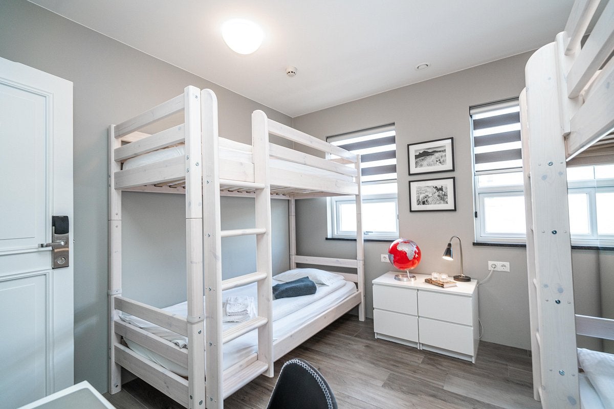 The newly renovated bedrooms and bathrooms of Guesthouse Keflavik are all located on the top floor. There are five twin rooms, a family room with two bunk beds, and two shared, regularly maintained bathrooms with showers; there is also a communal kitchenette.