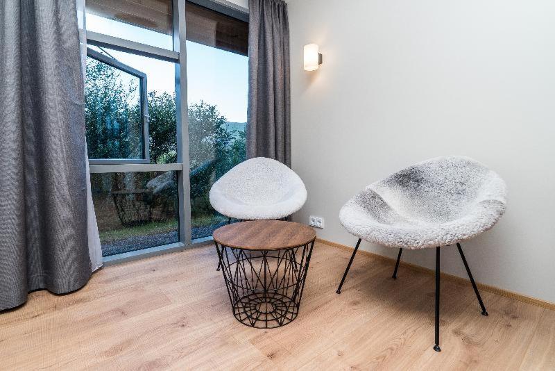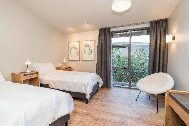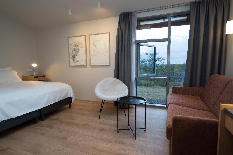 At Hotel Husafell, there is a range of rooms to choose from, all of which have en suite bathrooms with showers, access to free WiFi, a minibar, and access to cable channels. Standard rooms can accommodate two in twin or double beds, while the superior and deluxe rooms have a sofa bed to accommodate one more. Those looking for more space can elect to get the suite, which sleeps two in an extra-large bed.