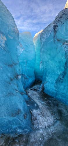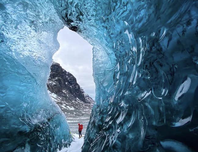 After the hike, you’ll arrive at the entrance to an ice cave, where the true magic of the tour begins. Inside the beautiful blue ice cave, you’ll be greeted by walls of shimmering aquamarine and sapphire colors, along with intricate ice sculptures created by melting and refreezing of the ice.