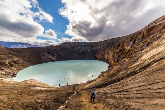 After exploring this incredible site, your guide will drive you to the magnificent Askja caldera. Here, they will lead you on a 1.5-mile (2.5-kilometer) hike across rugged, beautiful terrain to the location.