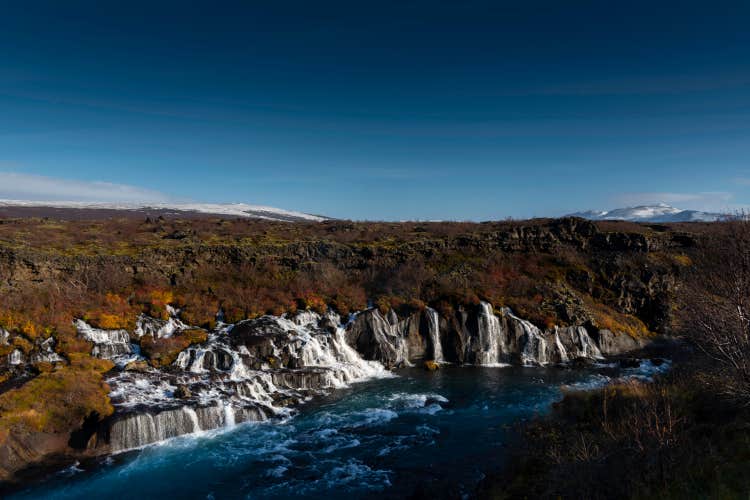 Your first stop is Hraunfossar Waterfalls, where countless clear streams flow directly out of a lava field into the turquoise Hvita River. Just a short walk away, you’ll find Barnafoss Waterfall, a rushing cascade rushing through a narrow volcanic canyon. The safe paths and viewing platforms around both falls make them easy to explore and photograph.