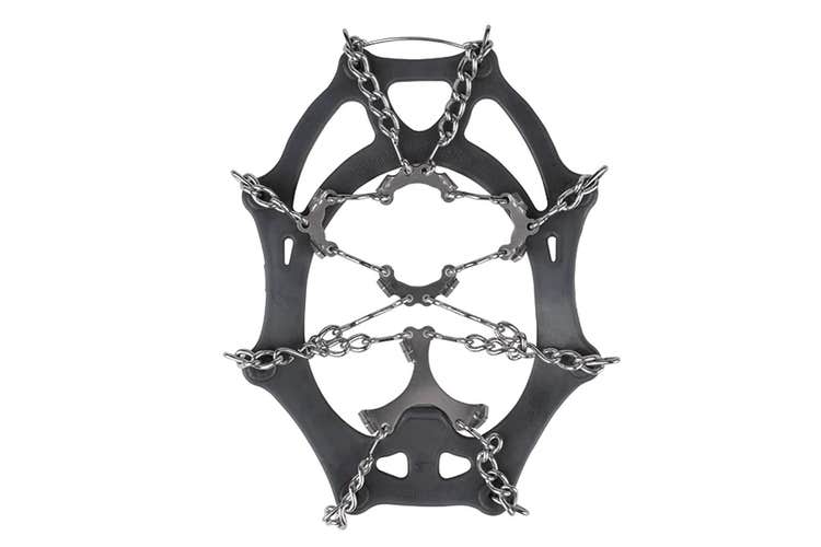 Crampons are devices used to enhance your traction when hiking or climbing. They are typically made of metal and are a frame that secures around your shoe and has spikes along the bottom.