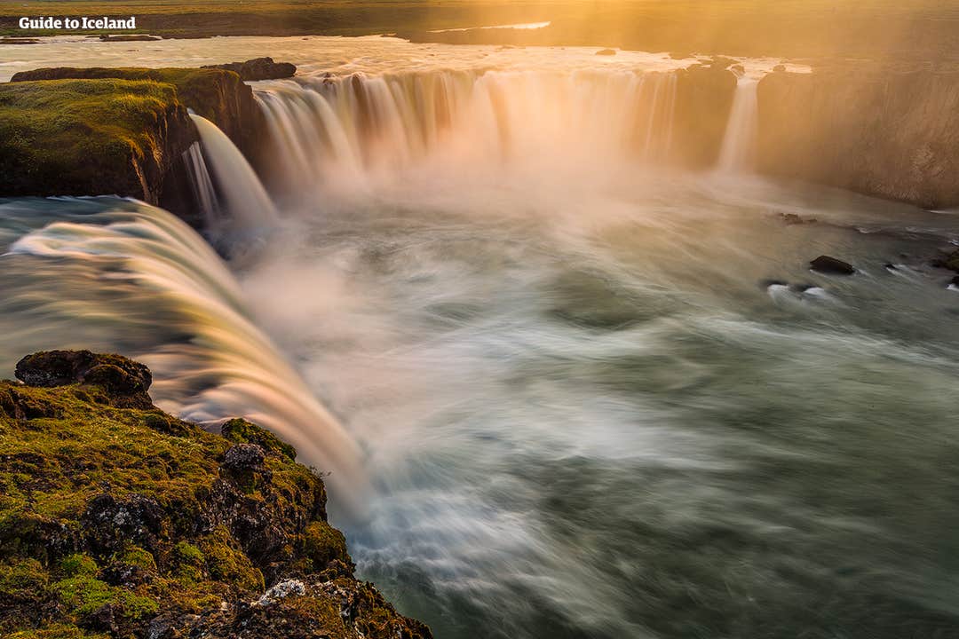 Godafoss is one of the most spectacular waterfalls in Iceland and a popular detour from the usual Diamond Circle tourist route. The water here falls from 40 feet (about 12 meters) across a width of almost 100 feet (30 meters), offering incredible vistas for visitors.