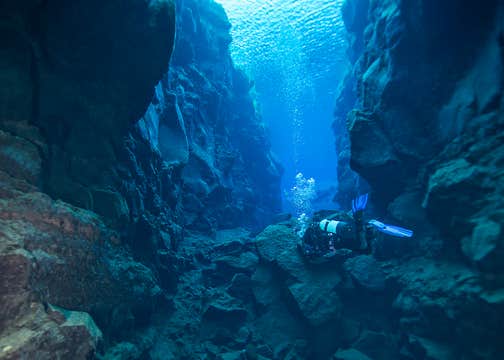 The Silfra diving tour takes you through four distinct sections of the fissure. Start at the Big Crack, where you’ll dive directly between two continental plates. Move on to Silfra Hall, where the fissure widens into an open, breathtaking chamber.