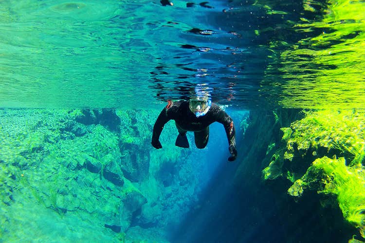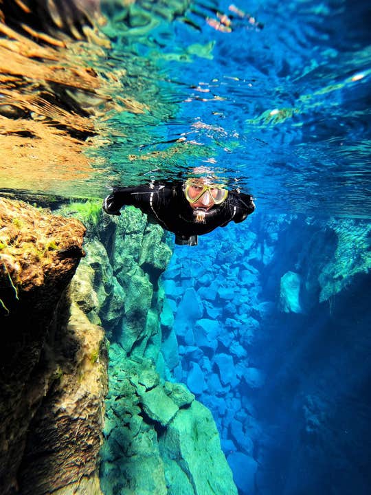 An otherworldly underwater landscape will surround you as you dive through the unbelievably pure water, equipped with drysuits and snorkeling gear. Colorful lava rocks, deep ravines, and exceptional visibility of up to 325 feet (100 meters) will welcome you below.