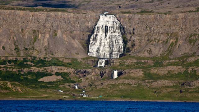 The drive to Dynjandi Waterfall takes you through a tunnel beneath Dyrafjordur, one of the scenic fjords in the Westfjords region. When you come out on the other side, you arrive at Dynjandisvogur Bay, a peaceful inlet surrounded by steep mountains.