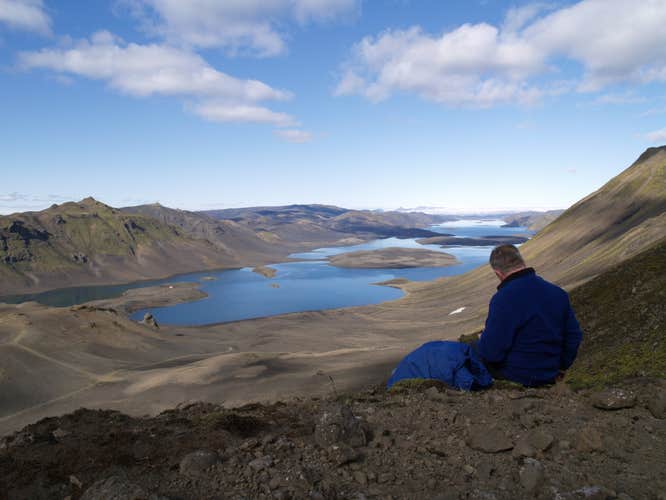 The trek's first significant highlight is walking up Sveinstindur mountain. At about 3,500 feet (over 1,000 meters) high, the peak provides mesmerizing views over Lake Langisjor and the vibrant rhyolite mountains, with geothermal fields adding to the enchantment.