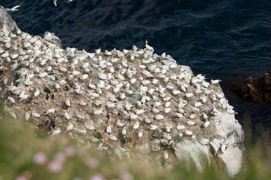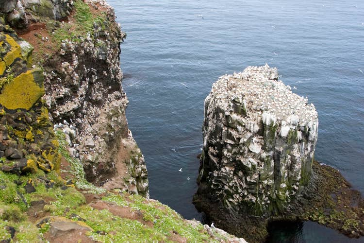 The cliffs are also home to an impressive colony of northern gannets, which nest on a large rock out at sea known as Stori Karl. The sight of these majestic birds gliding effortlessly through the air or tending to their nests is truly a spectacle to behold.