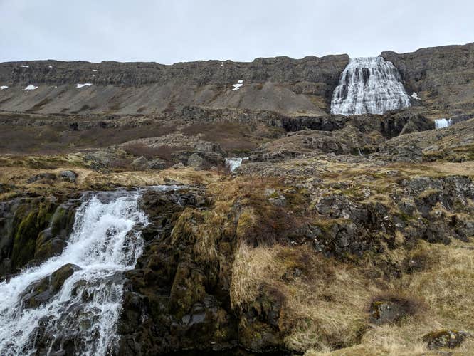 You can take a scenic walk past several smaller cascades for a close-up look at Dynjandi or admire it from afar. This waterfall is called the Jewel of the Westfjords and resembles a bridal veil flowing down the rocky hillside.