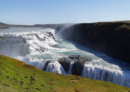 The Gullfoss waterfall is considered one of the most beautiful waterfalls in the country. Gullfoss, meaning "Golden Falls," cascades dramatically into a deep canyon from a two-tiered cascade of 105 feet (32 meters). Its heavy mist often creates rainbows on sunny days.