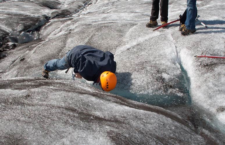 At the foot of the glacier, your friendly knowledgeable and experienced glacier guide will provide you with all of the necessary trekking equipment, including a helmet, crampons and ice axe, if needed - hiking boots and rain gear can be rented at extra cost. They will also proceed to give an educational and entertaining safety briefing, laying out what to look for on the glacier, and sharing interesting facts about the region. When everyone is geared up, you will begin to make your way up the ice cap.