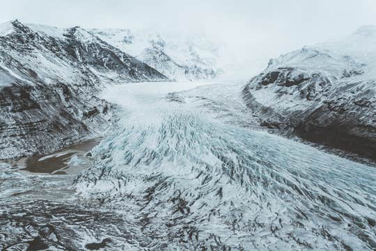 Next, you'll fly over the Svinafellsjokull glacier, a location so otherworldly that it was used as a filming site for the alien ice planet in the 2014 movie "Interstellar." The unique ice formations and breathtaking scenery make this one of the highlights of the tour.