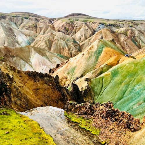 Your once-in-a-lifetime aerial experience takes you to the Landmannalaugar mountain range. These colorful peaks boast vibrant red, orange, yellow, and brown hues, often dotted with snow for a striking contrast.