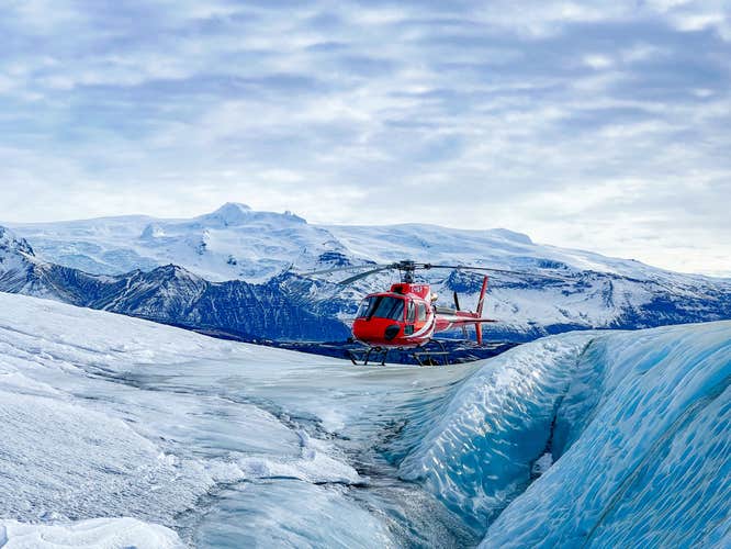 The helicopter rotors will start to spin, and you'll ascend into the skies, leaving behind the stark beauty of the Skaftafell Nature Reserve. You'll soar over an icy wilderness below and enjoy spectacular views of the mighty Vatnajokull glacier, Iceland's largest ice cap.