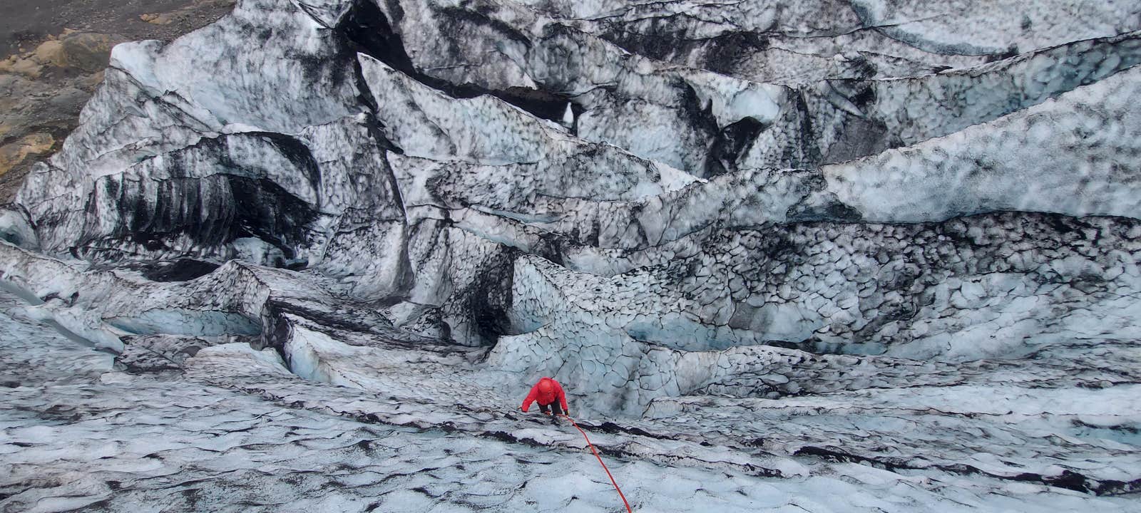 We will be climbing on Sólheimajökull glacier tongue, but it is an outlet of the great Mýrdalsjökull glacier. Mýrdalsjökull glacier is the fourth largest glacier in Iceland 590 km², underneath it is the volcano Katla. Katla has erupted about 20 times in historical times, it last erupted in 1918, that lasted for 23 days. Sólheimajökull itself stretches about 8 to 11 km down from Mýrdalsjökull and ranges from one to two kilometres in width. There are still marks on Sólheimajökull after a powerful eruption from Katla in the year of 1918.