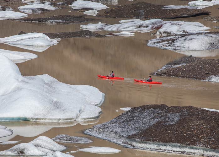 Your combination tour begins when you meet your expert guide at the tour operator's base next to the Solheimajokull glacier parking lot. First, you'll take a five-minute scenic walk to the lagoon, the starting point for your kayaking excursion.