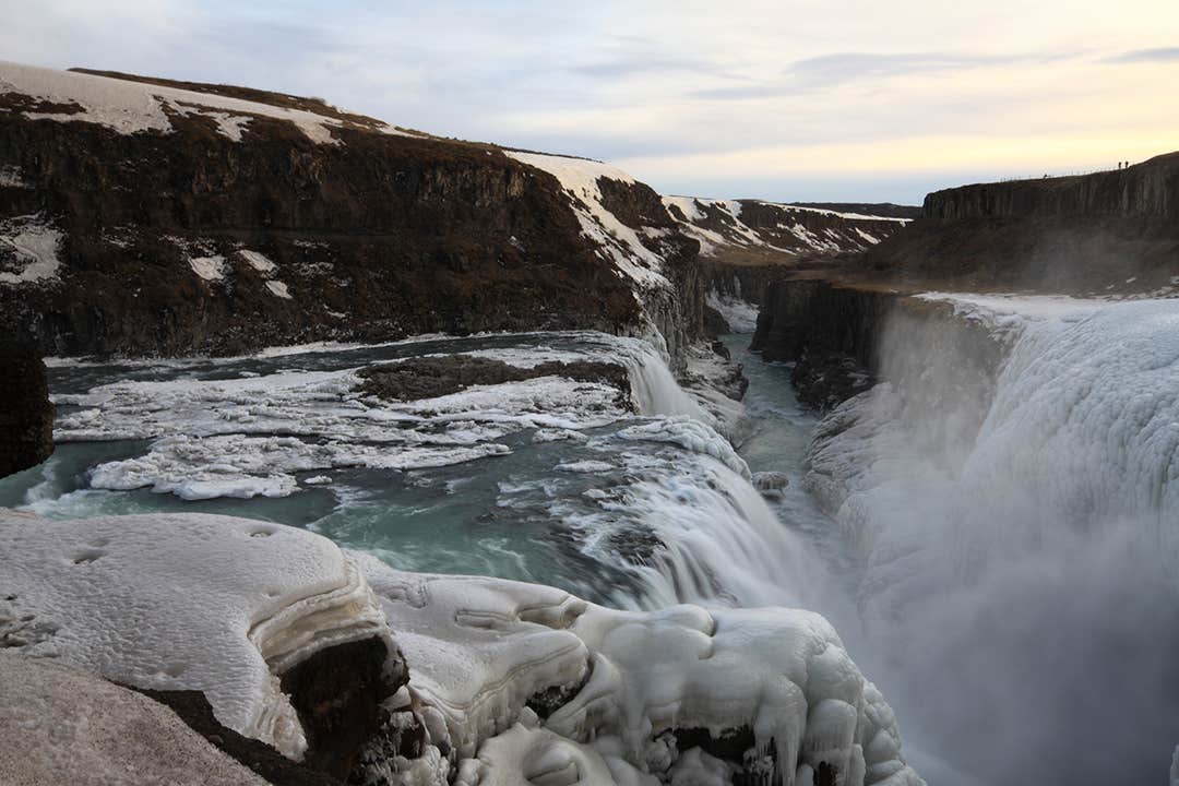 The third stop on the Golden Circle is the magnificent Gullfoss, named ‘the Golden Waterfall’ due to the rainbows that shimmer above it in good weather. Plunging into an ancient gorge, the roots of the waterfall come from Langjökull glacier, which is visible from the falls on a clear day. When the ground is not too icy, you can approach a viewing platform at the waterfall’s edge, to truly appreciate its incredible power.