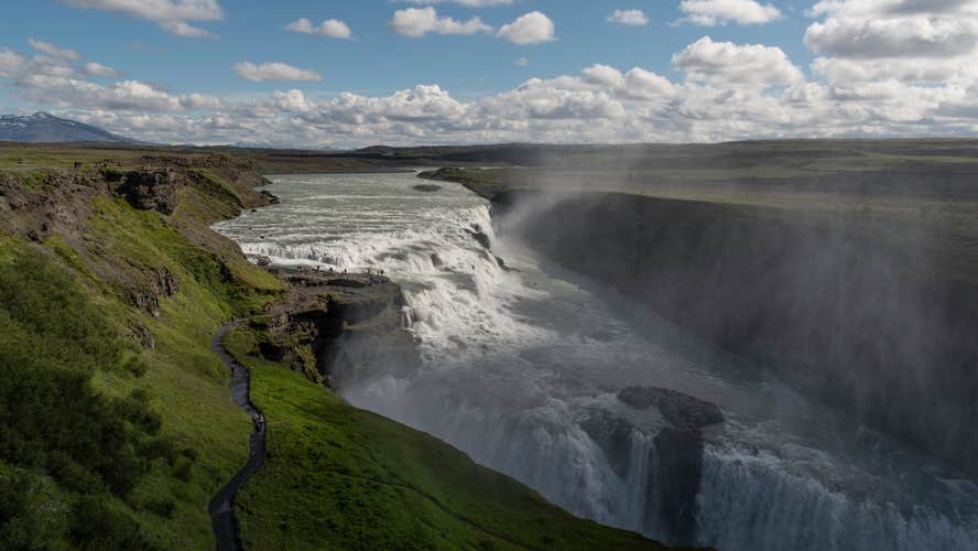 The final stop on your trip is the Gullfoss waterfall. A stunning 105 feet (32 meters) tall, the waterfall is split into two stages and makes for a dramatic display. The first cascade is shorter at 36 feet (11 meters) tall, with the more significant drop being 69 feet (21 meters) high.