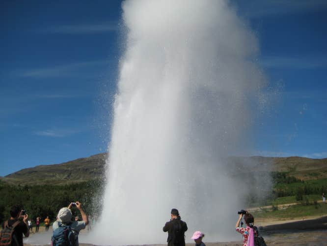 From there, you’ll move on to the erupting geysers at Geysir Geothermal Area. There, you’ll find Strokkur, one of Iceland’s most active geysers. Strokkur erupts every 5 to 10 minutes, creating a water column that can reach up to 130 feet (40 meters). You can also find hot springs, fumaroles, and bubbling mud pools dotted around.