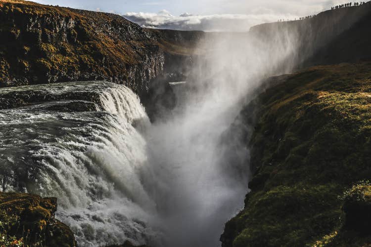 The cold waters of Gullfoss originate from the Hvita river and the nearby Langjokull glacier. On a sunny day, rainbows spring from the mist created by this Icelandic waterfall.