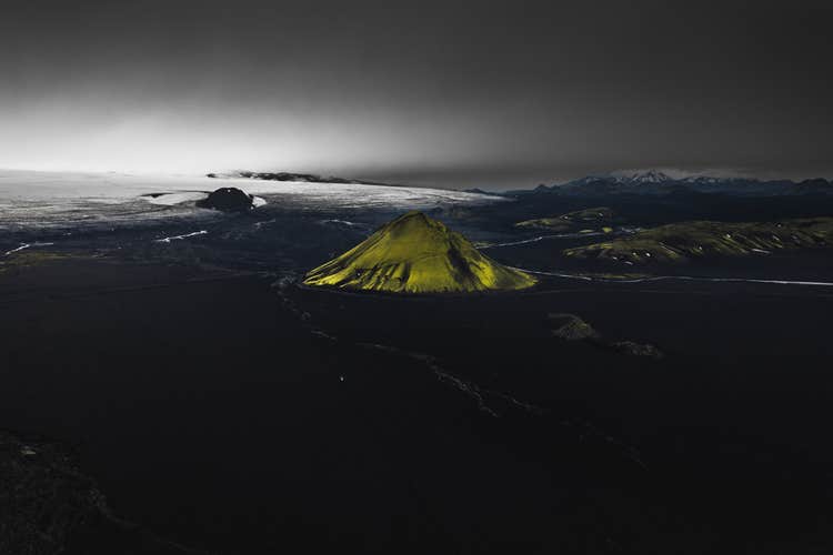 Maelifell is a composite cone volcano standing 2,595 feet (791 meters) tall and has spectacular contrasting surroundings. Its pointy peak gives it a striking appearance, and its green slopes stand out amid the black-sand desert around it.