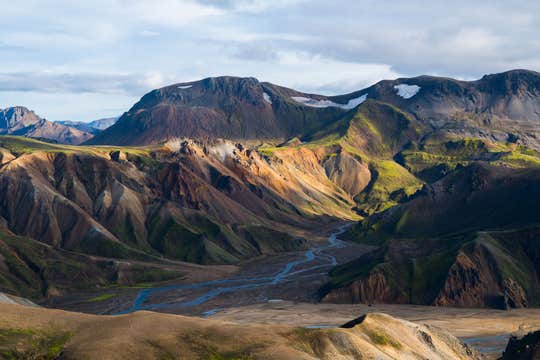 The highlight of the journey is Landmannalaugar, a geothermal paradise in the Highlands. Rainbow-colored mountains rise beside steaming vents, and the light shifts across the slopes throughout the day.