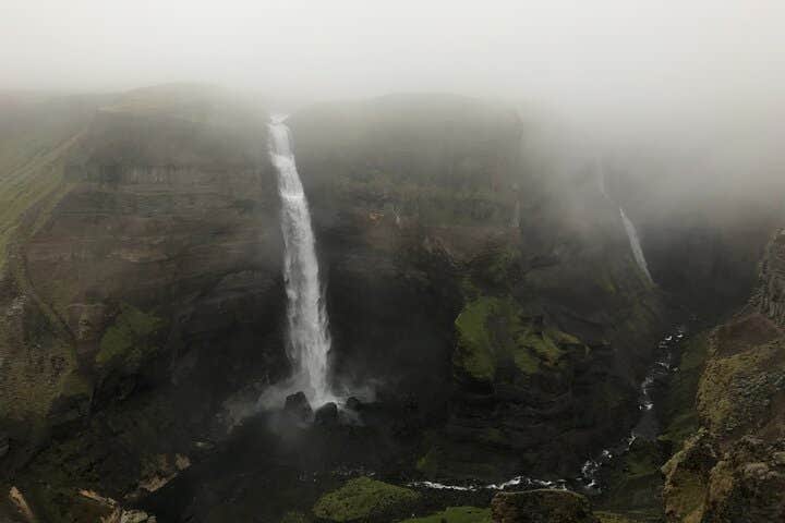 From there, your Highlands tour takes you deeper into waterfall country. Haifoss, one of Iceland’s tallest waterfalls, plunges 400 feet (122 meters) into a canyon, with the smaller Granni Waterfall tumbling beside it. Together, they create an awe-inspiring display surrounded by moss-covered cliffs.