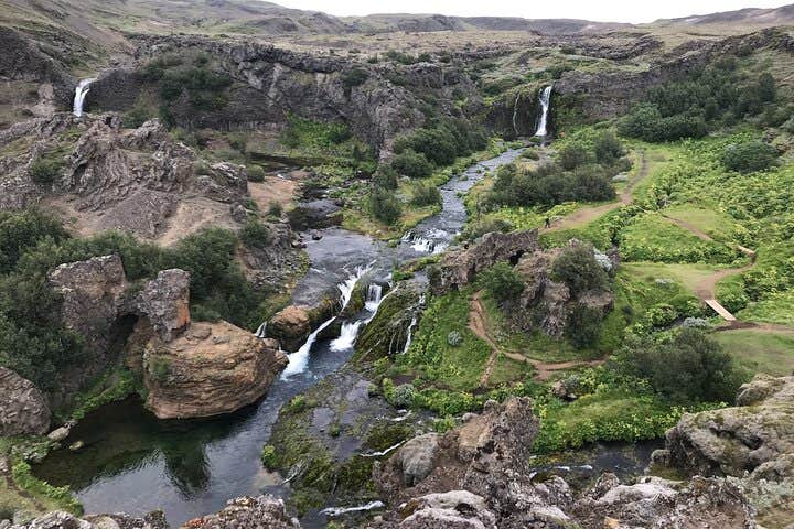 Your first stop is Gjain, a hidden gem in the Thorsardalur Valley. Here, dramatic basalt columns frame waterfalls and streams, making it a paradise for photographers and nature lovers.