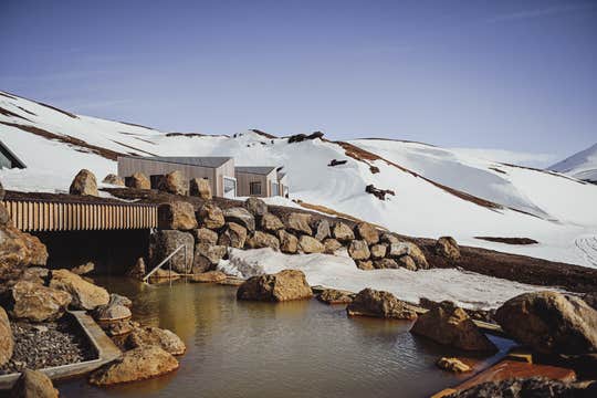 The Highland Baths, locally known as Halendisbodin, are located 116 miles (187 kilometers) from Reykjavik, making them easy to drive to throughout the summer. En route, you can visit the attractions of the Golden Circle, West Iceland, or other Highland locations, allowing the geothermal springs to be part of a more extensive day out sightseeing.