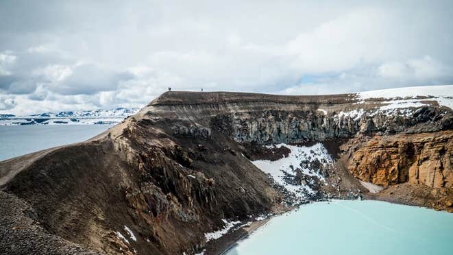 Soon you'll arrive at Askja, parking at the Vikraborgir crater car park. The car park is the starting point for the 1.5-mile (2.4-kilometer) hiking trail to Askja and Viti lakes. Take in the panoramic volcanic landscape as you enjoy the walk, which should take around 40 minutes.