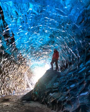 Then you'll get to marvel at the incredible scenery inside the glacier; the electric blue ice walls and the sheer and sparkling ice sculptures found inside. After exploring the cave for a while, snapping a few photos in the process, you'll head back to the vehicle and return to the glacier lagoon.