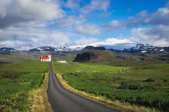 Experience the beauty of Snaefellsnes Peninsula, often called "Iceland in miniature." Let the audio tour guide you to must-see attractions like Kirkjufell mountain, the iconic small black church of Budir, and the unique rock formations at Djupalonssandur black sand beach.