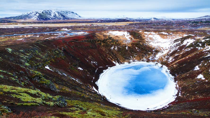 Kerid’s striking visuals change with the seasons, making it a year-round attraction. During summer, the vibrant red volcanic rock contrasts beautifully with patches of lush green moss, while winter brings a serene blanket of snow and a frozen lake, creating a picturesque scene.