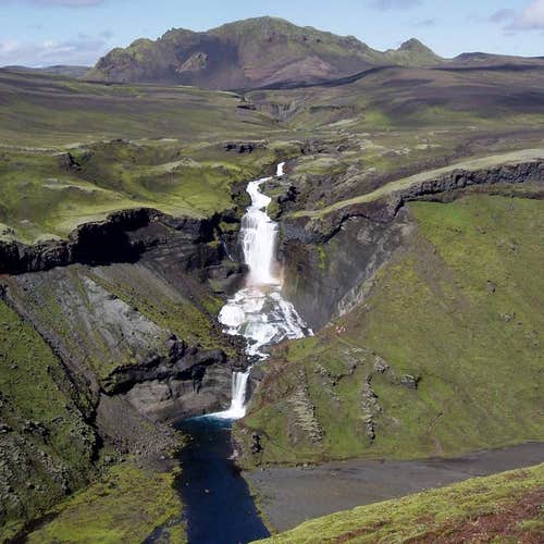 Next, you'll go in the super jeep to the Eldgja canyon. Formed by eruptions in 934 AD, this massive fissure stretches over 37 miles (60 kilometers) from the Gjatindur mountain to the Myrdalsjokull glacier.