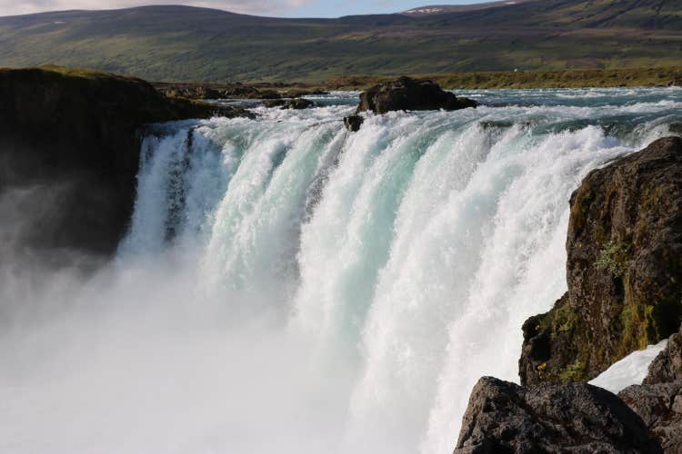 The cascade is known for its wide horseshoe shape, with water from the Skjalfandafljot river dropping around 39 feet (12 meters) into a rocky basin.