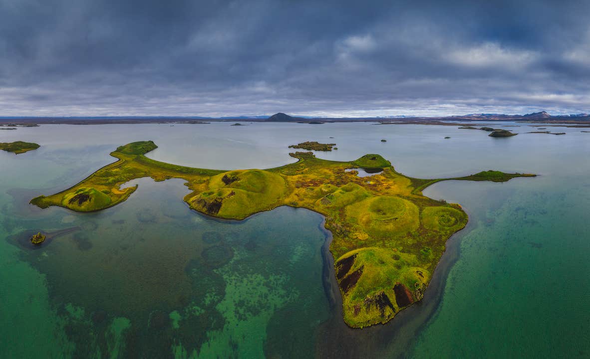 A notable feature of Myvatn is its pseudocraters scattered throughout the shallow waters. In summer, these formations and the surrounding wetlands are home to nesting birds and ducks and thriving vegetation.