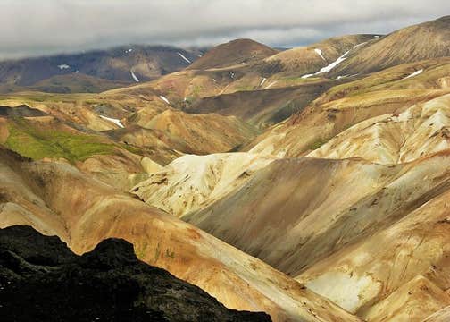 Leaving the hut, you'll traverse the Laugahraun lava fields, formed after a 1477 volcanic eruption. The black dried magma, in parts covered in green moss, contrasts wonderfully with the colorful mountains. It's a landscape unique to this area that you'll be thrilled you made time to see.