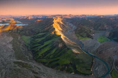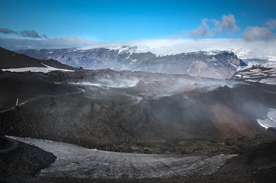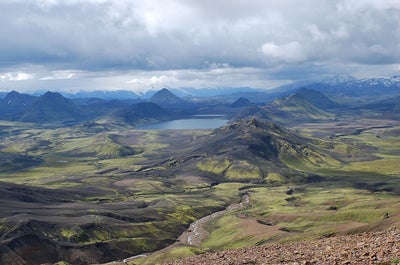 Your first hike is at the Landmannalaugar area of the Fjallabak Nature Reserve, the starting point of the Laugavegur trail and 121 miles (195 kilometers) from Reykjavik. The first day will take you to Iceland’s most colorful rhyolite mountains, the expansive Laugahraun lava field, and the enormous Brennisteinsalda volcano.
