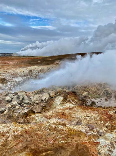 Next on your schedule is a visit to the Gunnuhver hot springs area. The area is named after a ghost, Gunna, who, according to local legend, haunted the region until a priest trapped her in one of the hot springs. You'll see large, bubbling mud pools, fumaroles, and steam vents releasing sulfur-scented steam clouds into the air. For your final stop of the day, you'll head to Brimketill, a naturally occurring lava rock pool surrounded by jagged lava formations. The name Brimketill translates to "whitewater cauldron," describing the frothy waves that frequently fill the pool.