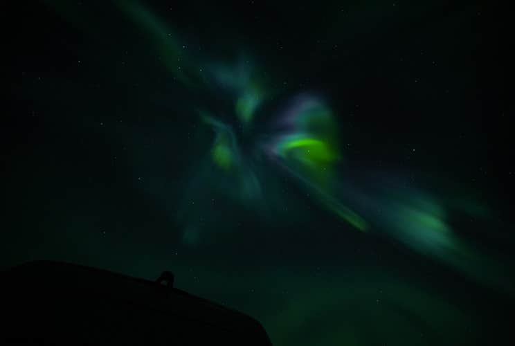 The Northern lights are essentially particles from a solar eruption, and when they hit the atmosphere, they create these lights in the sky that are usually green but sometimes white and purple. When the activity is high, they move around like dancers in the evening sky.
