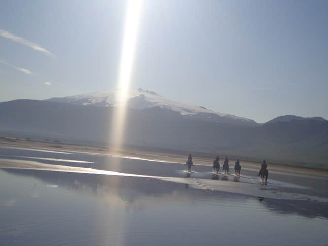 As you begin your horseback adventure, the guide will take you through the stunning Hraunlandarif beach, nestling between Arnarstapi and Budir. Hraunlandarif is a picturesque coastal area in Snaefellsnes, famous for its vast stretches of golden sand with dramatic lava formations.