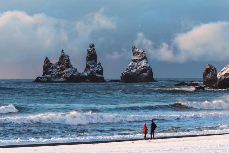 Your guide shares tips for capturing rainbows in the mist at Skogafoss and tells stories about the falls. Then you travel to Reynisfjara, where you walk across black sand, admire basalt columns, and follow safety advice as waves crash by Reynisdrangar Sea Stacks.