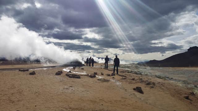 Volcanic forces created Lake Myvatn, and you can see these at work on the barren mountainside of Namarskard. This plateau has a row of boiling mud pits, and the sulfur smell fills the air.