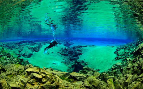 You'll explore the four main parts of Silfra, starting with the Big Crack, the narrowest section of the fissure. Next, you'll enter Silfra Hall, where the clarity and colors of the water become even more apparent. In the Silfra Cathedral, the deepest part of the dive, experience the 'chandelier effects' of rising bubbles from divers ahead. Conclude your dive in the tranquil Silfra Lagoon, with its endless visibility.