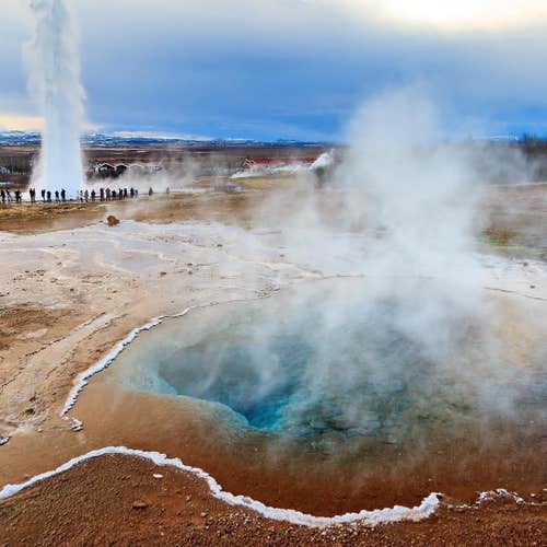 Following this, you’ll arrive at the Geysir geothermal area in Haukadalur valley. Its main draw, Strokkur geyser, erupts every five to ten minutes, sending steaming water 66 feet (20 meters) into the sky.